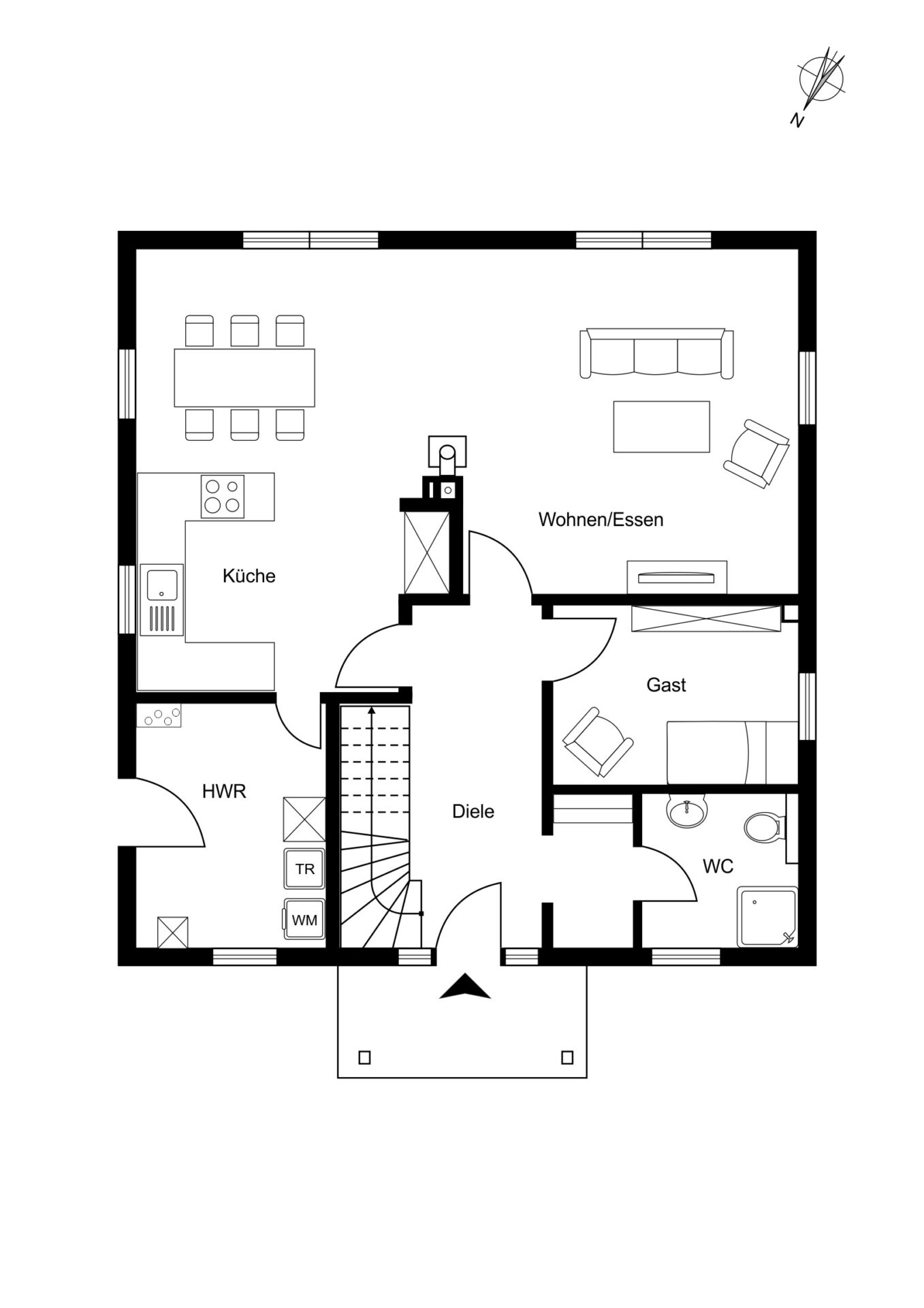 Der offene Essbereich geht direkt über in die moderne, offene Küche. Ein Tresen verbindet beide Bereiche perfekt miteinander und bietet die Möglichkeit dem Koch gemütlich bei der Arbeit zuzusehen, während man außerdem den Blick in den Garten oder auf den lodernden Kaminofen genießt. Auch der Koch selbst hat beim Kochen den Raum im Blick, da die Kücheninsel perfekt zum Raum ausgerichtet ist. Von der Küche hat man einen Zugang zum Hauswirtschaftsraum. Hier ist die Haustechnik, Lüftungsanlage und Heizung untergebracht, außerdem findet sich noch ausreichend Platz für Waschmaschine, Trockner und weitere Vorräte. Der Hauswirtschaftsraum bietet auch einen Zugang nach draußen, so das Einkäufe bequem vom Auto in die Küche verräumt werden können.
