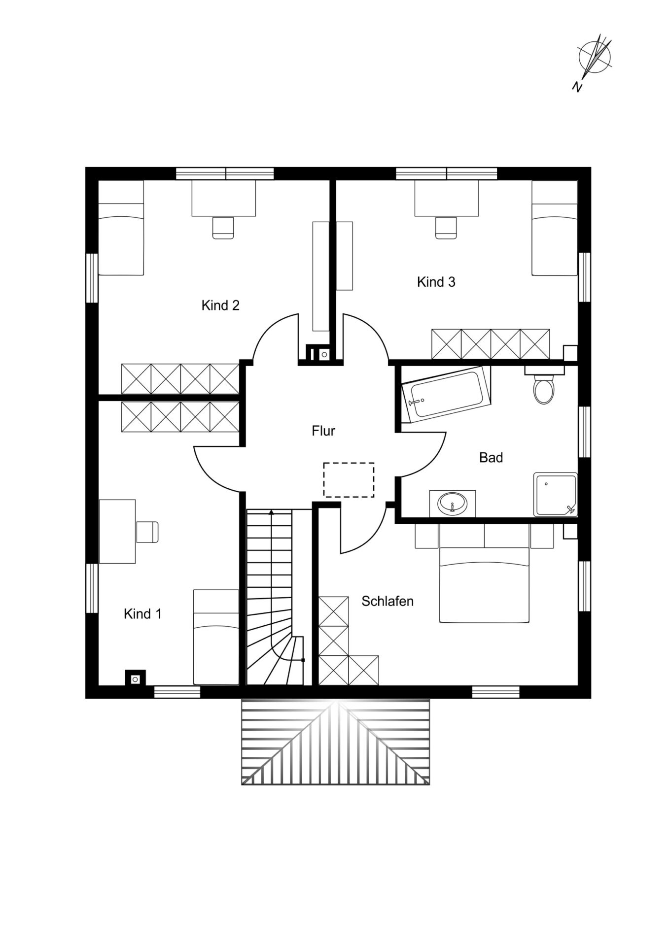 Neben dem Familienbad ist ein lichtdurchflutetes Kinderzimmer mit ca. 16 m² beheimatet. Es verfügt über zwei große Fenster nach Süden und ein Fenster nach Westen. Direkt daneben ist ein weiteres lichtdurchflutetes Kinderzimmer mit ca. 17 m². Die Fenster dieses Zimmers öffnen den Blick gen Süden und Osten. Das dritte Kinderzimmer des Obergeschosses umfasst ca. 15 m² und hat ebenfalls zwei Fenster mit nördlicher Blickrichtung. Im Obergeschoss zeigt sich der große Vorteil dieser Stadtvilla, denn alle Zimmer haben Wände ohne Schrägen, so dass das Platzangebot wirklich erstklassig ist.
