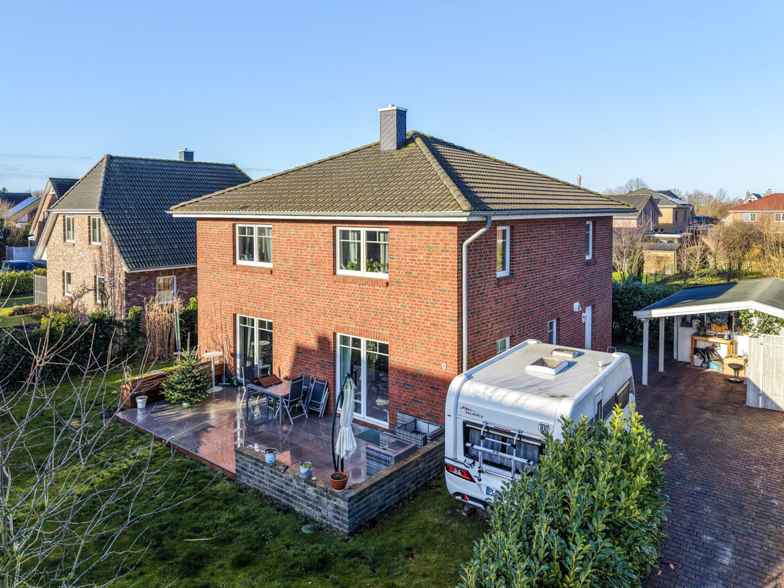 Die Stadtvilla liegt in einem ruhigen Wohngebiet ca. 3 km von der Ostsee entfernt. Sie ist mit einem wunderschönen Natursteinwall und einer immergrünen Hecke eingefriedet. Die geschmackvoll angelegte Auffahrt neben dem Haus führt auf das Carport mit angrenzendem Schuppen zu. Das Carport bietet einen geschützten Stellplatz für Ihr Fahrzeug, während der Schuppen Raum für Ihre Gartengeräte bereithält, darüber hinaus ist neben dem Haus Platz für ein weiteres Fahrzeug.