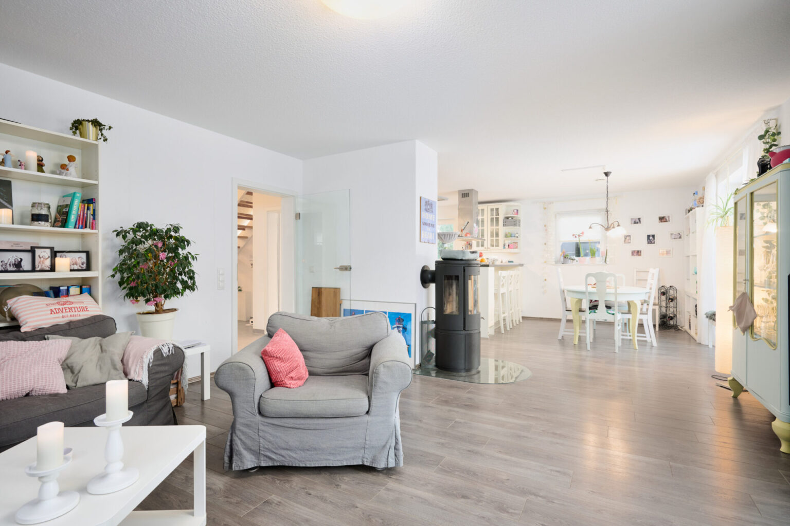 Direkt gegenüber der Eingangstür liegt der Zugang zum Herzstück der Villa – dem wunderschönen, großzügigen Wohn- und Essbereich. Dieser Bereich ist mit einem Laminatboden ausgestattet, der zu drei Seiten einsehbare Kamin im Zentrum des Raumes sorgt für eine wunderschöne behagliche Atmosphäre. Der Wohn- und Essbereich ist nach Süden ausgerichtet und bietet einen direkten Zugang auf die großzügige Terrasse mit südlicher Ausrichtung.